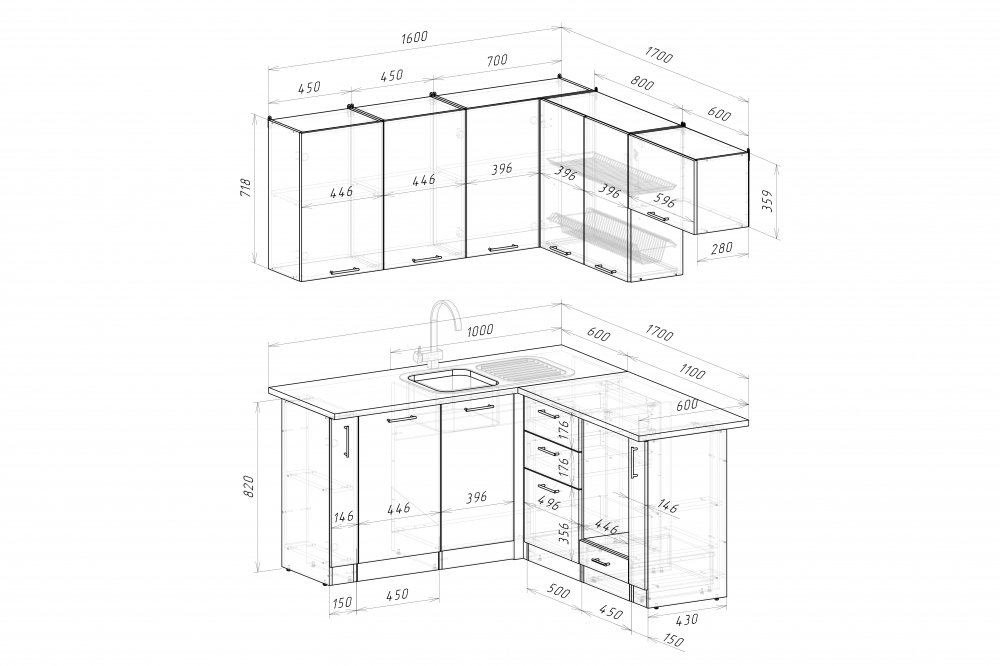 Ширина: 1600*1700 мм; Глубина: 600 мм (со столешницей)
