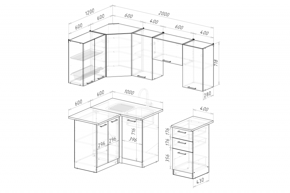Ширина: 1200*2000 мм; Глубина: 600 мм (со столешницей)