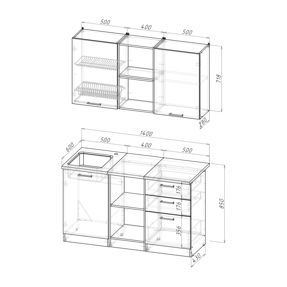 Ширина: 1400 мм; Глубина: 600 мм (со столешницей)