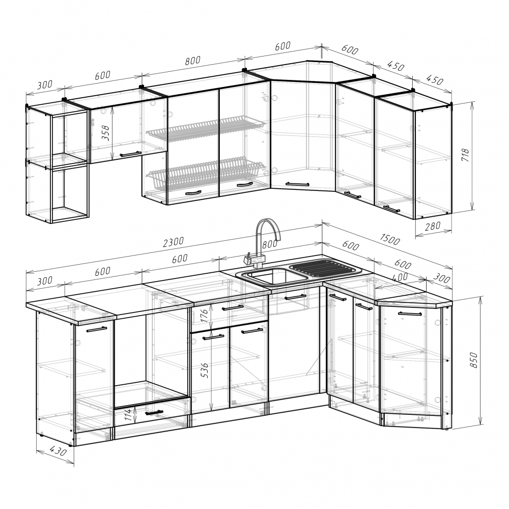 Ширина: 2300*1500 мм; Глубина: 400/600 мм (со столешницей)