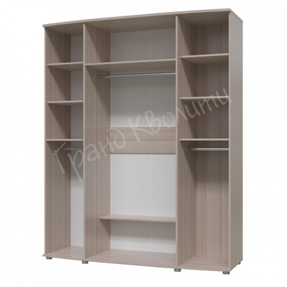 Шкаф с распашными дверями, с двух сторон отделение с тремя антресольными полками и горизонтальными штангами под ними. В центре шкаф украшают зеркала из 12-ти сегментов, внутри расположены антресольная полка, горизонтальная штанга и нижняя полка.