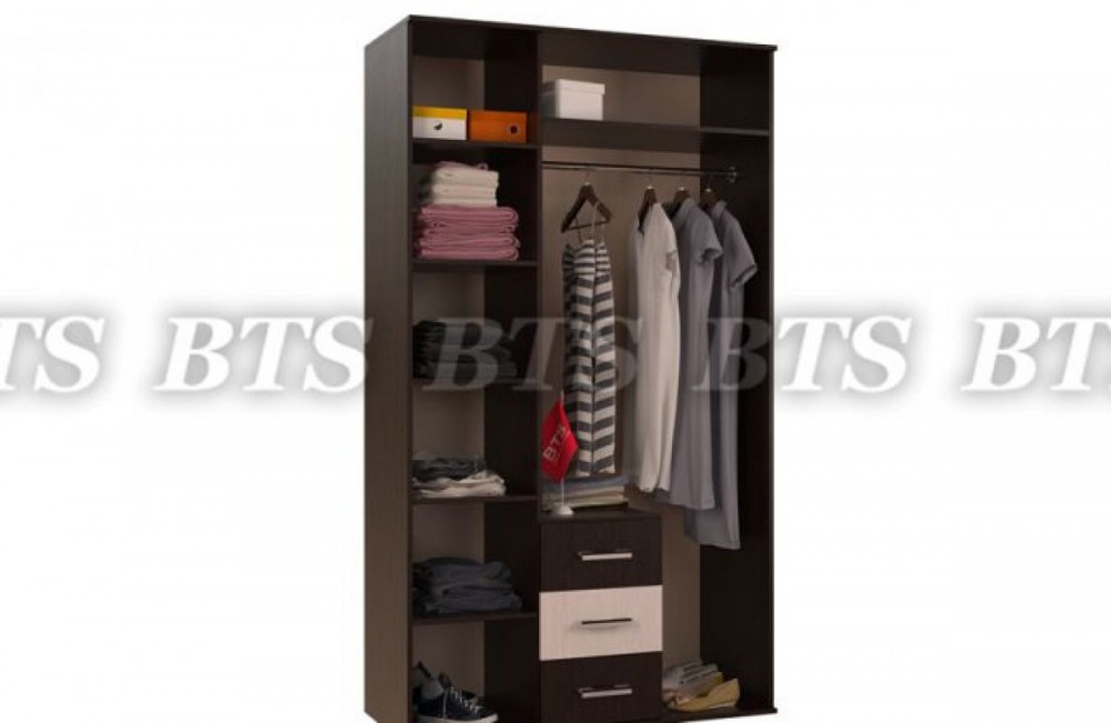 Шкаф трехстворчатый для одежды имеет 3 ящика, зеркальную дверь. Шкаф оснащен металлической перекладиной и полками для одежды.